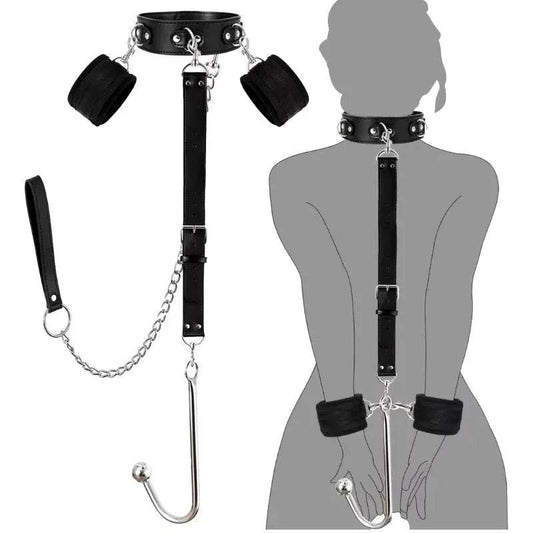 Arnés de gancho Anal BDSM para adultos, collar de Bondage, esposas, Kit de Bondage esclavo, juegos sexuales, cuero ajustable, tapón Anal de Metal, coqueteo