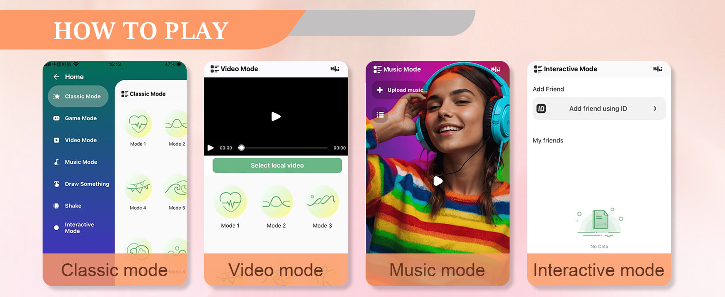 - Aplicación y control remoto: la aplicación tiene 4 modos diferentes integrados de juego, modo recomendado/modo de video/modo de video/modo de bricolaje/modo de sonido. El control remoto puede controlar 9 vibraciones diferentes individualmente, de débil a fuerte